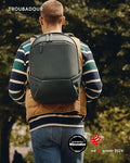 Introducing the next-level everyday backpack in a compact design—perfect for your commute, gym kit, and day trips. Crafted from lightweight, waterproof fabric with durable lining and zippers, it features a unique zipped pocket on the shoulder strap for secure and easy access to your phone and passport. The backpack includes a separate, padded section for work essentials, accommodating up to a 16-inch MacBook or 15-inch PC, along with multiple internal pockets for optimal organization. Additional features include a zipped external pocket, two large bottle holders, a front valuables pocket for key fobs and an AirTag, and a breathable back panel with ergonomic padded shoulder straps for comfort. The triple-layer bonded grab handle adds extra comfort, while the luggage sleeve conveniently slides over a suitcase handle. Finished with machined metal branding and zipper pulls made from recycled metal, this backpack combines style and sustainability.